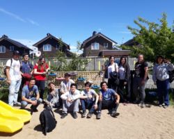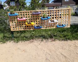 “En el jardin del encanto nos ubicamos en la Escuela Arturo Alessandri Palma, donde nos encargamos de hacer un jardin en el patio de juegos en base a materiales reciclados. Hicimos maceteros en base de botellas de plastico, cortando un poco del lado de estas, pintandolas y finalmente colgándolas en las rejillas del patio. Tambien pintamos neumáticos usados, colgándolos y poniendo flores dentro de ellos. Fue una actividad corta, simple pero muy enriquecedora donde conocimos gente nueva y lo pasamos muy bien.”